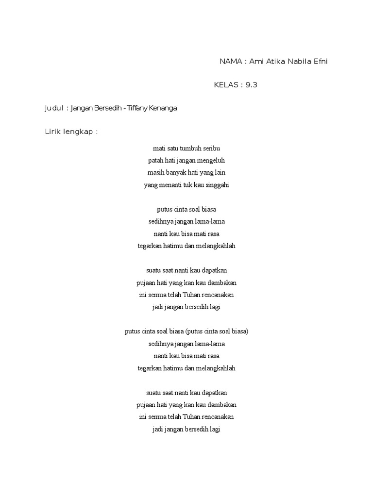 | Baca: Lirik Lagu Tiffany Kenanga Jangan Bersedih Dunia Lirik Not Lagu |